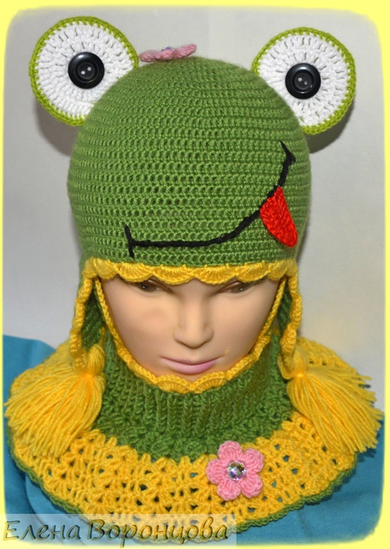 1. Комплект "Веселый лягушонок" (манишка+шапка), размер 48-50см, пряжа BAMBINO.