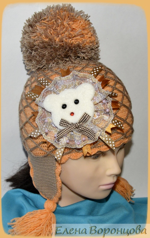 Брошь с мишуткой отстегивается. Помпон отвязывается.