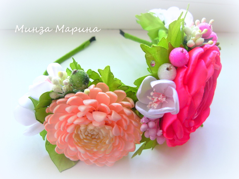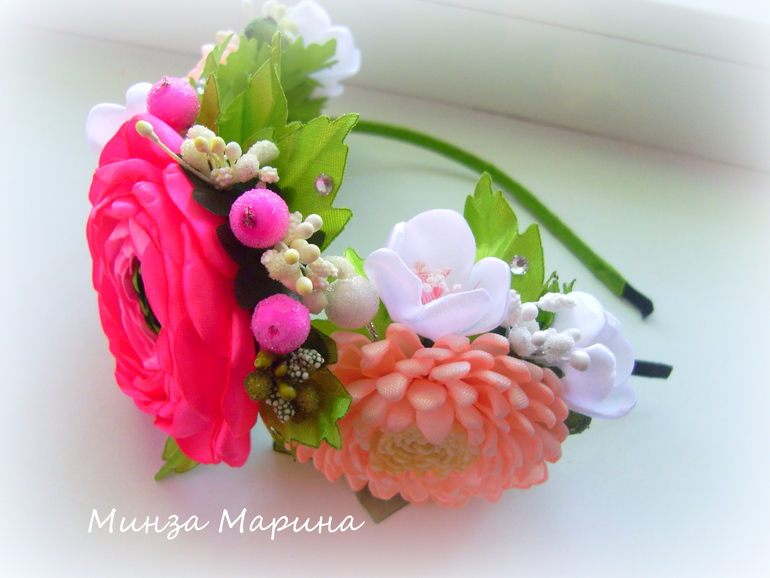 Ободок - ранункулюс с хризантемами - вот такое необычное сочетание получилось