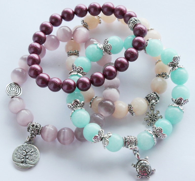 3) Комплект состоит из четырёх браслетов из натуральных камней. Использовались такие материалы как, агат, кошачий глаз, жемчуг майорка и фурнитура под серебро.