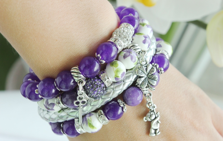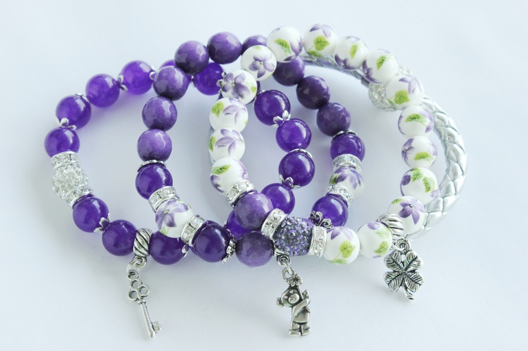 1) Комплект состоит из четырёх браслетов браслетов из натуральных камней и двух кожаных браслетов. Использовались такие материалы как, агат, яшма зелёная, керамические бусины, жемчуг майорка и фурнитура под серебро.