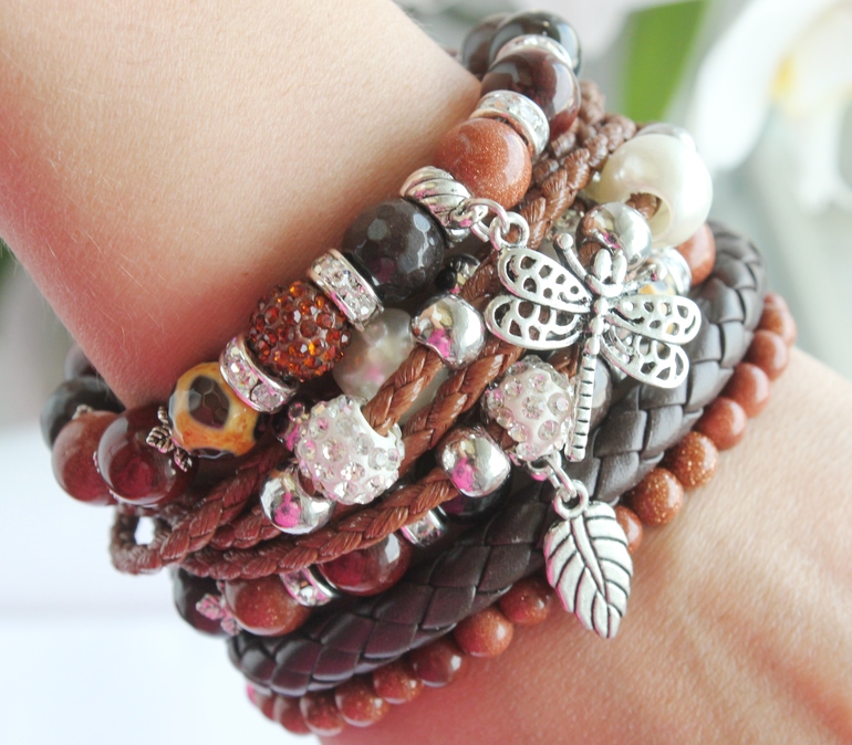 2) Браслет состоит из четырёх браслетов из натуральных камней и одного кожаного браслета. Использовались такие материалы как, агат, авантюрин, кошачий глаз, рондели со стразами, бусина со стразами и фурнитура под бронзу.