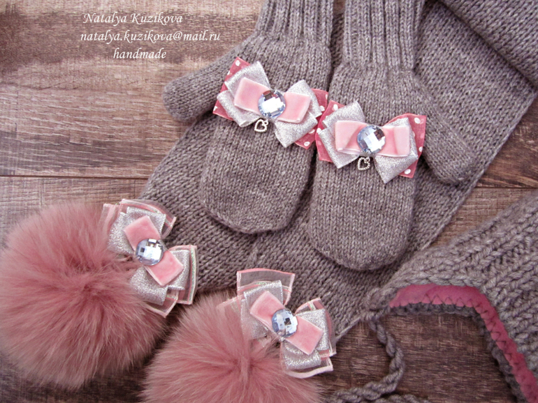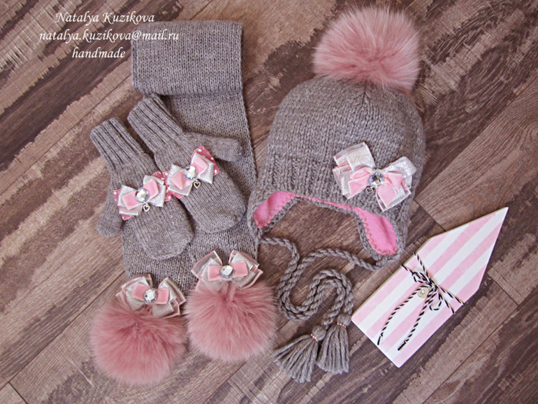 Он очень теплый! Шапочка из толстой шерстяной пряжи на флисовом подкладе. Варежки и шарфик из белее тонкой нити. Варежки тоже на флисе.