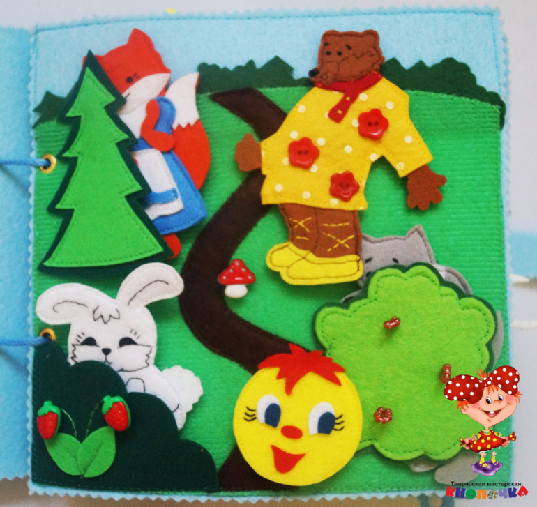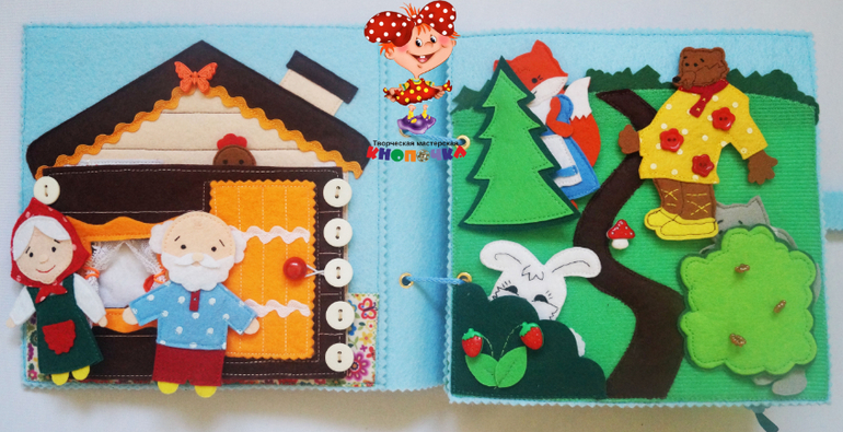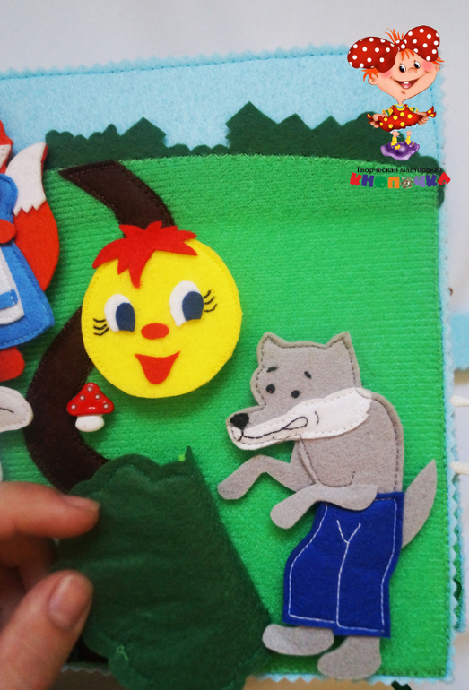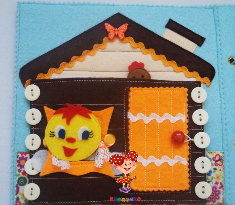 Справа расположен сам теремок. Все окошечки застегиваются/расстегиваются на пуговицах. В крыше есть кармашек для медведя. Внизу на кустике есть перетяжка цветочек-бабочка, под травкой прячется божья коровка. Нам очень нравится играть в "Ку-ку" с ними ))