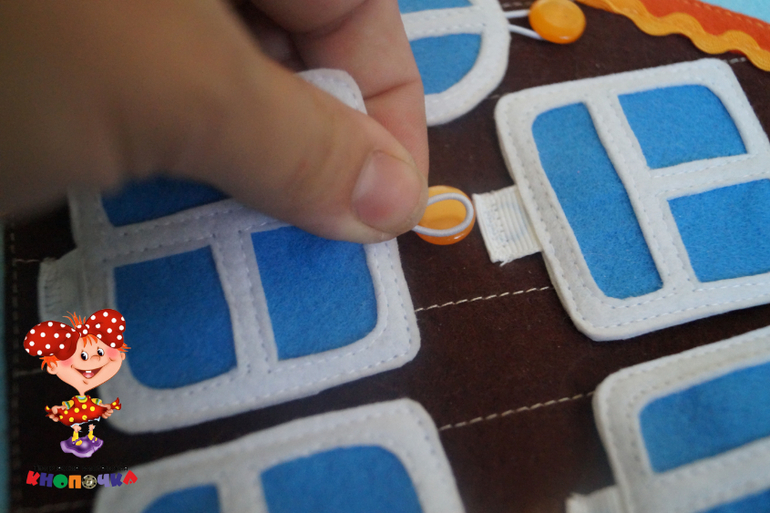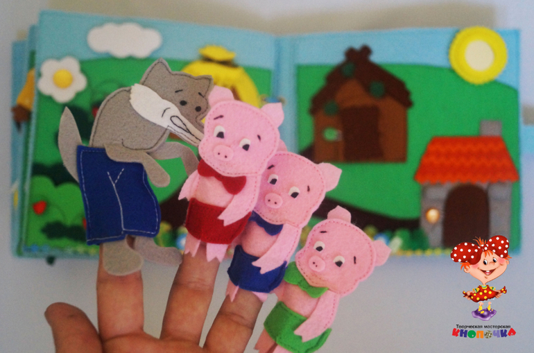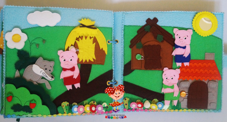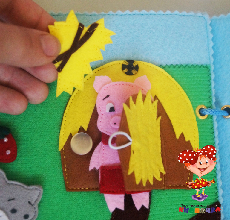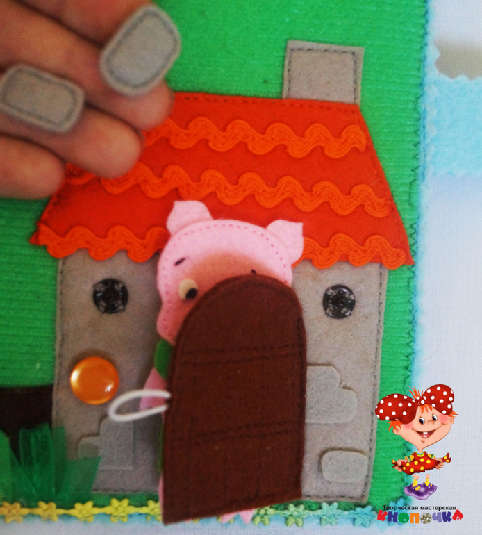 У каждого домика открываются/закрываются дверцы на пуговички. Также снимаются элементы домов из которых поросята строили домики (солома, хворост, кирпич), они крепятся на кнопки. Сами поросята и вол на липучках, также являются пальчиковым театром, домики тоже на липучках, чтобы их мог сдуть волк по сценарию сказки.
