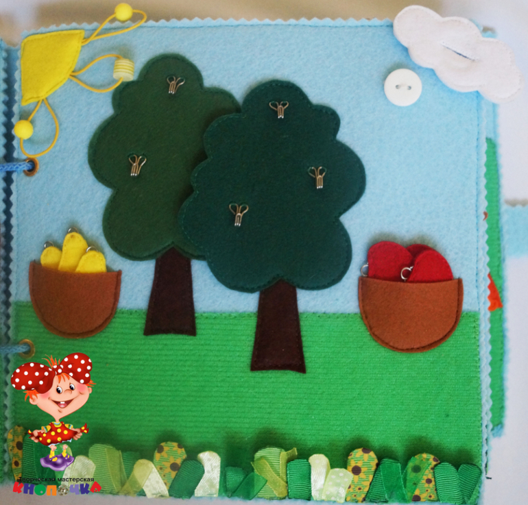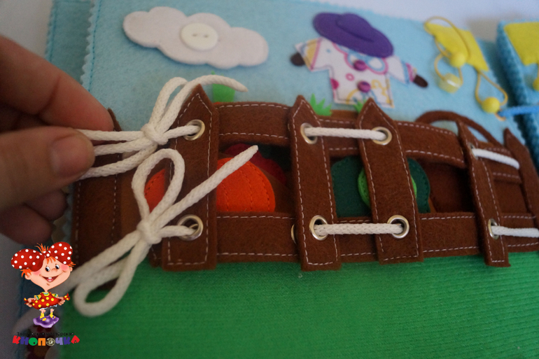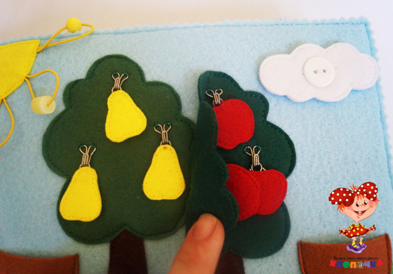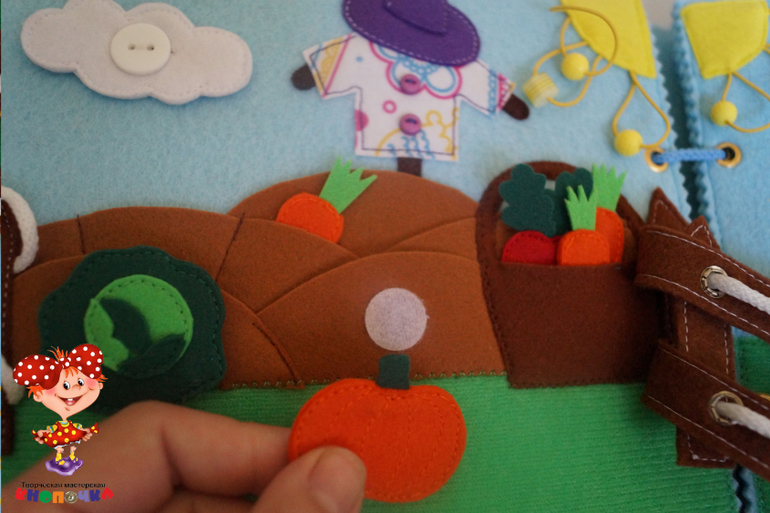 Слева за забором сам огород. Собираем урожай, изучаем какой продукт как называется, считаем их, называем цвета. Забор выполнила в виде шнуровки. У солнышка лучики сделаны из резинки с бусинами разного размера. Дочке очень нравится дергать за эти лучики. Облачка на пуговичках.