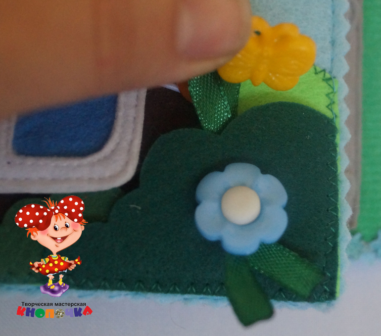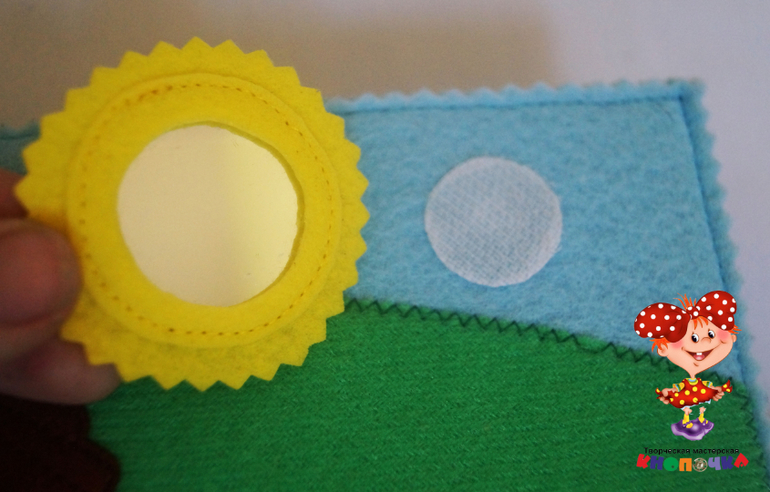 Еще есть полянка с ягодками, в ней используются крепления - крючки и пуговица. Облачко и солнышко держатся на липучке, можно менять их местами, также солнышко является зеркалом.