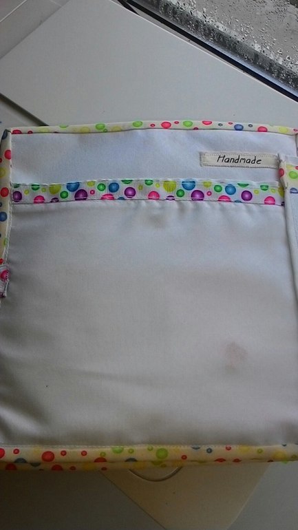 Спасибо. Да заказчица довольна) По краю косая бейка. А на кармашке репсовая лента в тему)