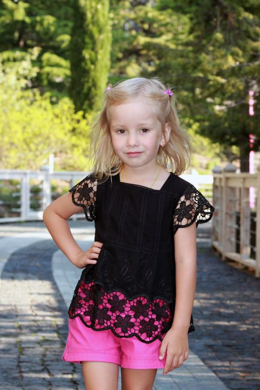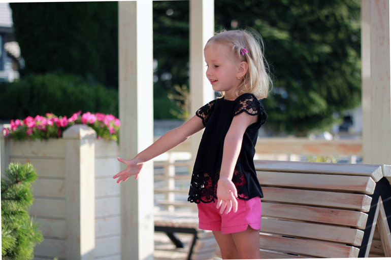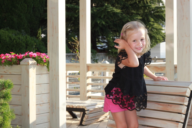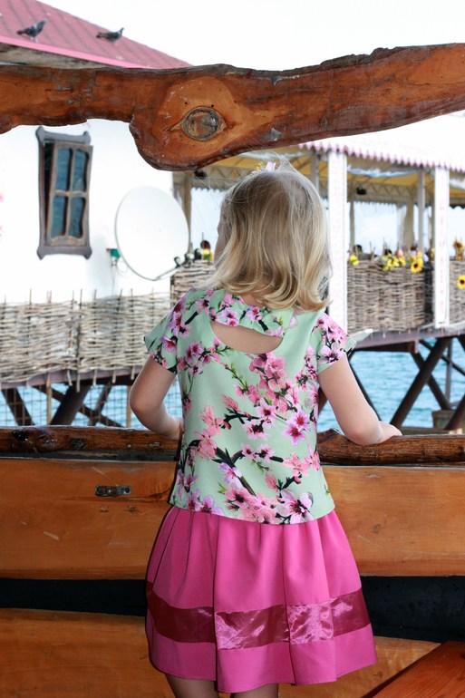 Полинкин топ с интересной спинкой. Носим не только с шортами, но и с юбками. На дочкиной юбке прозрачная вставка - вынужденная мера, ткани было очень мало, моя так и задумывалась изначально. Топ не на выпуск, но дочка носится, как угорелая, поэтому фотки только такие.