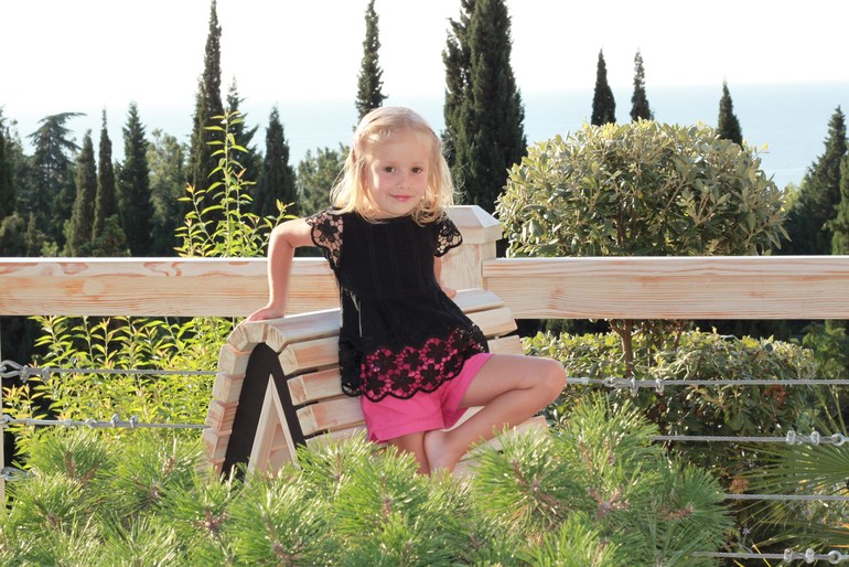 Из остатков от пошива платья получился топ для Полинки, без выкройки, комбинированный - спинка из трикотажа, перед из шитья. Верхнюю часть переда пришлось собирать из маленьких отрезочков, все швы закрыты тоненьким х/б кружевом.