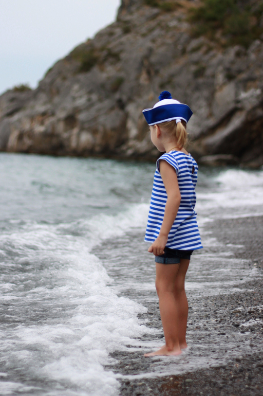 Из тельняшки огромного размера сшила себе топ, просто отрезала лишнее по бокам, убрала длину и рукава, из них вышел топ и для дочки.