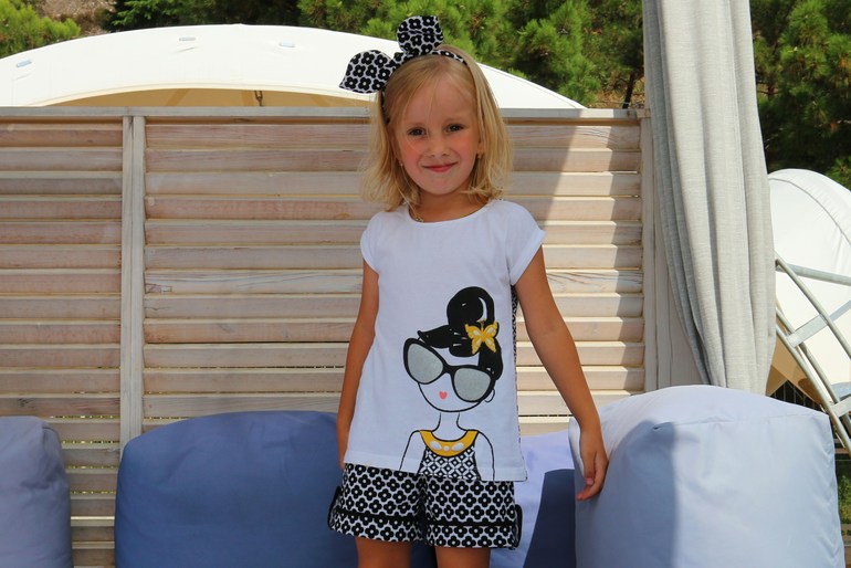 Начну с Полинки, сшила для нее шорты из американского хлопка, выкройка старая проверенная, про нее уже писала, хотя на следующий год надо будет подобрать другую, вытянулась моя девочка. Шорты просты в шитье, на резинке, для отделки - х/б косая бейка и пуговицы. В комплект - ободок.