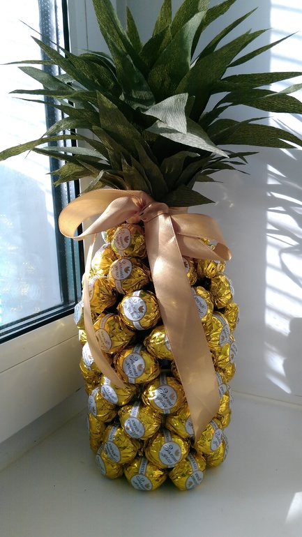 Делала в подарок своей тёте на юбилей ананас из конфет)