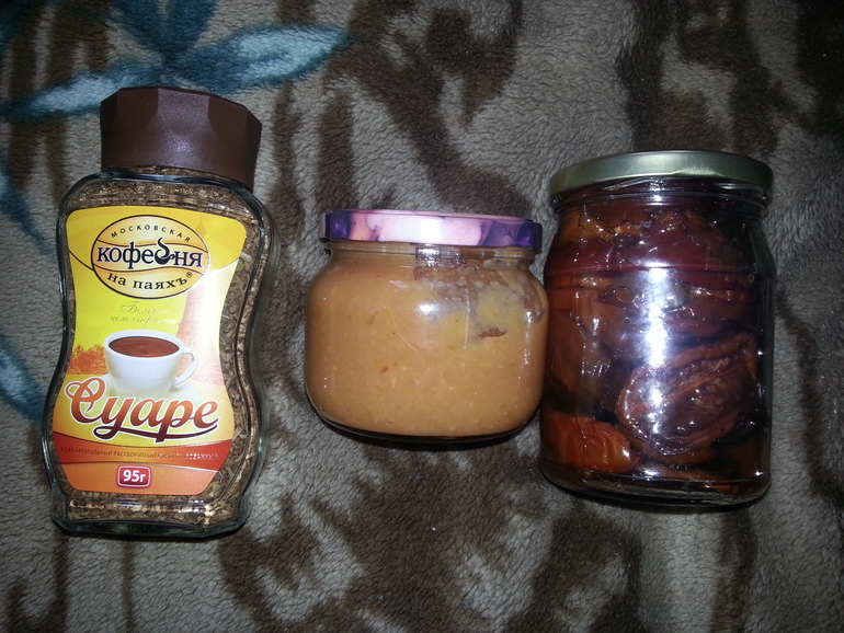 Вкусняшки.вяленые помидорки Оля сама их делала,варенько и кофе.