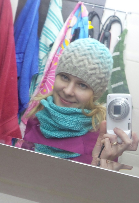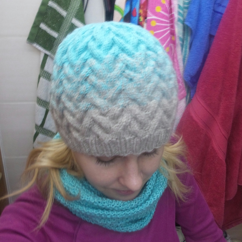Спасибо. Пряжа бежевая Ализе ланаголд, в процессе вязки я её " расчленяла" голубая вита кристал. Вязала без схем, на глаз, по кругу, рисунок называется теневая коса.