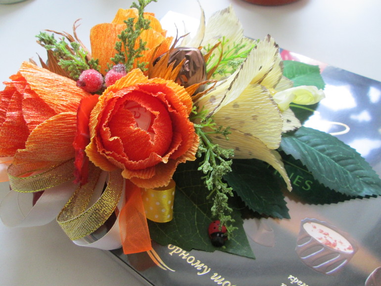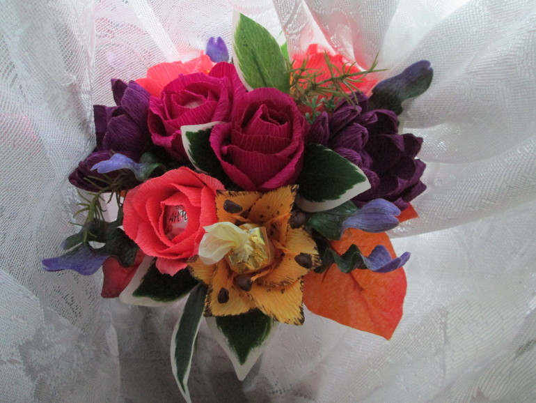 Оля, спасибо. Ты знаешь, у нас в городе только я и еще 2 тетки делают букеты из конфет (одна неплохие делает, вторая - жуткие), а в городе у нас население пол миллиона. Так вот - все жалуются, что нет заказов. Народ или совсем обнищал, или жаба их душит, фиг поймешь. Я уже елки начала делать - посмотри в моем дневнике, если интересно