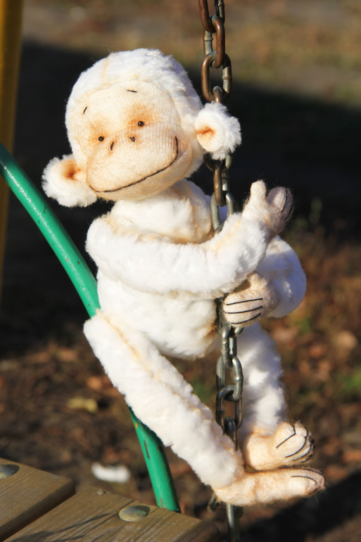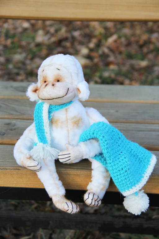Игрушечный мир - животныеДостался мне по обмену красивенький белый мех (спасибо, Тамаре), обезьян не заставил долго ждать...30 см ростом, ручки-ножки гнуться как хочешь, внутри синтепух и стеклянный гранулят...6-ти шплинтовое соединение, тонирован масляными красками... климат у нас суровый....ни тебе пальм, ни бананов...потому носит шапку и шарфик...
