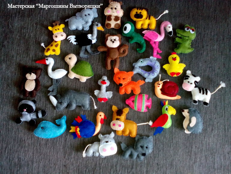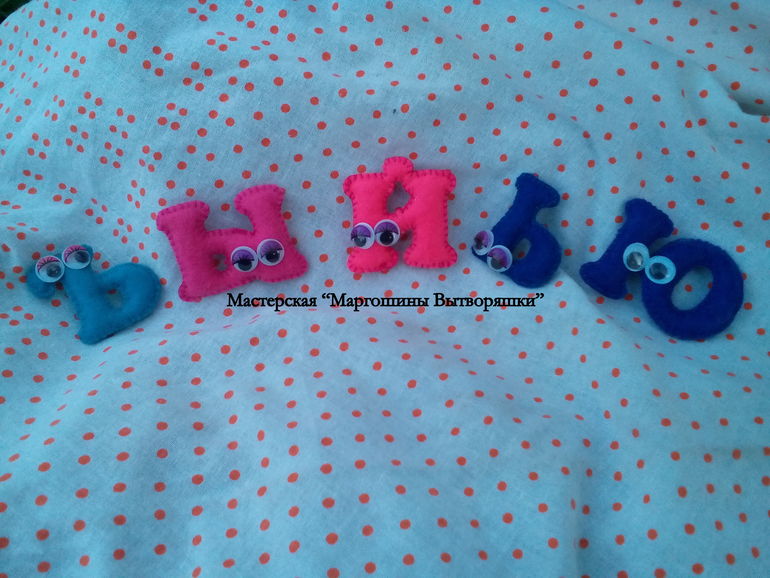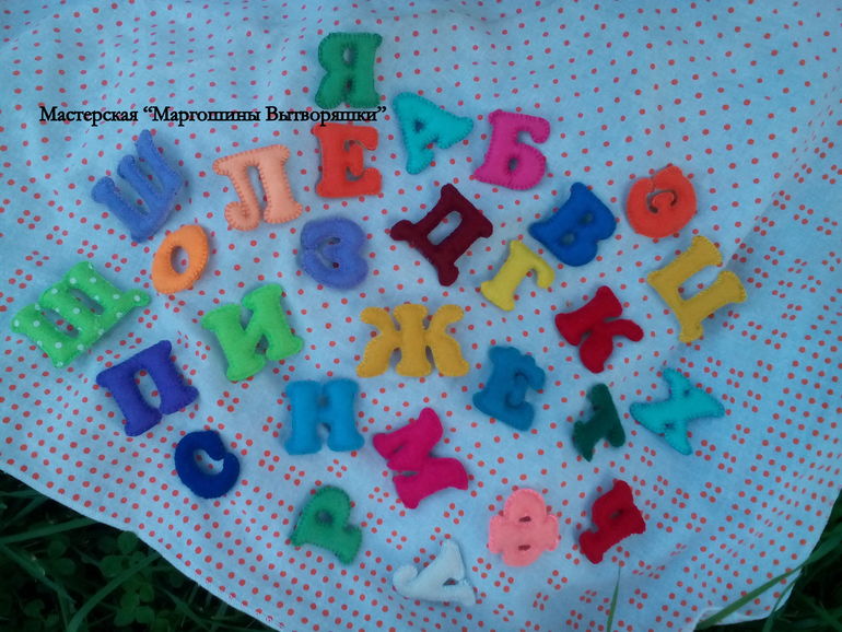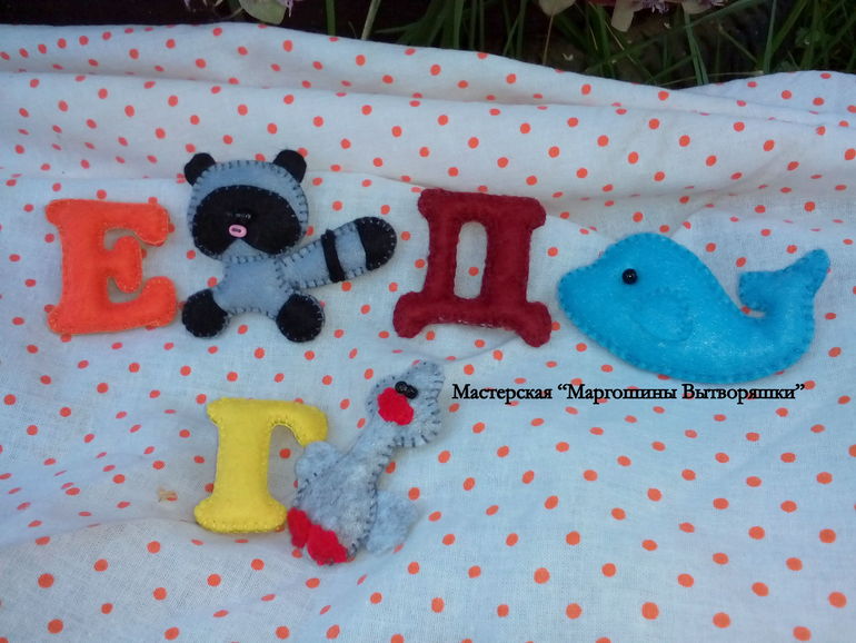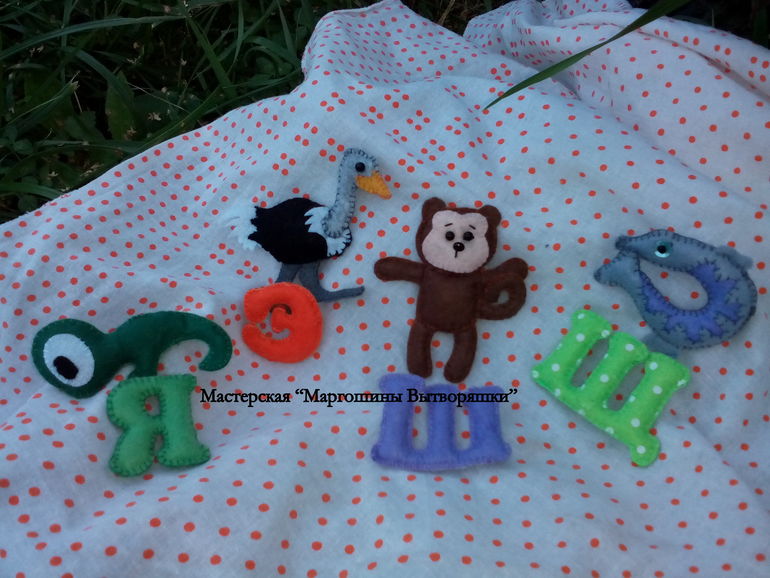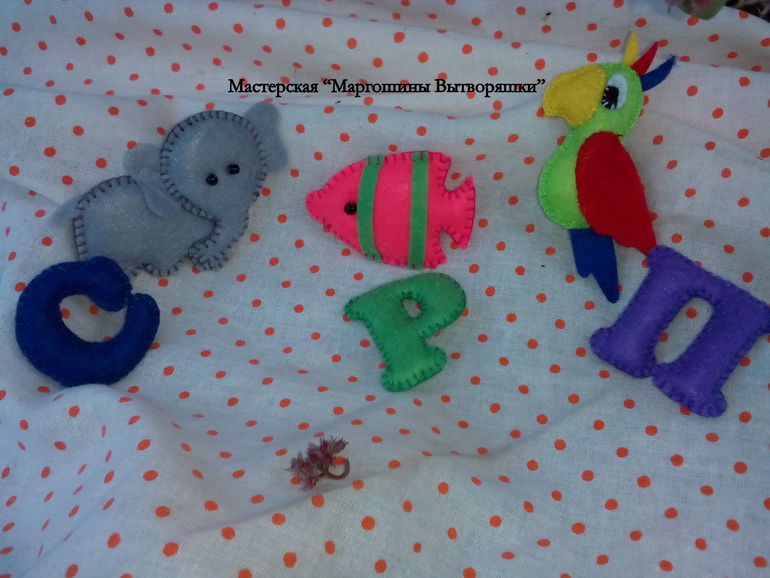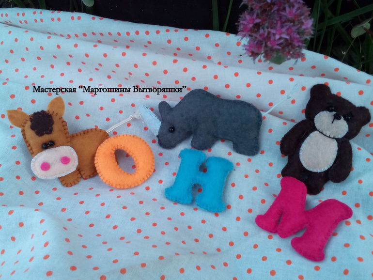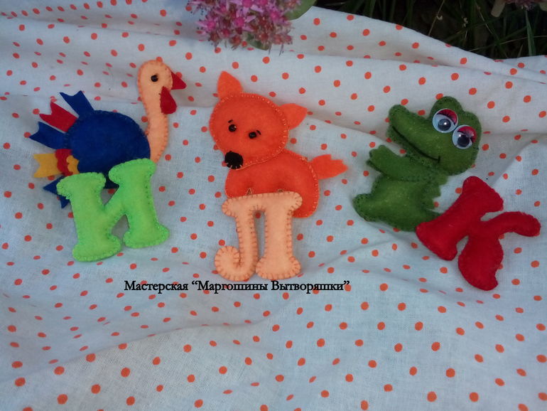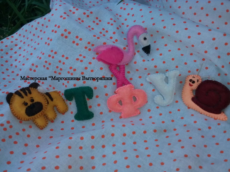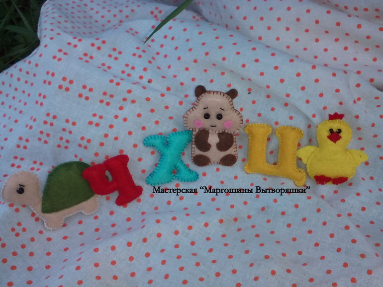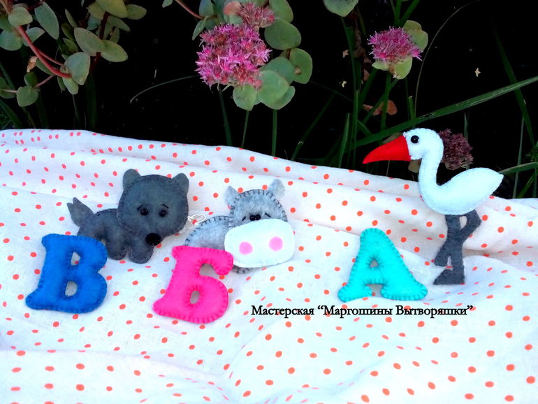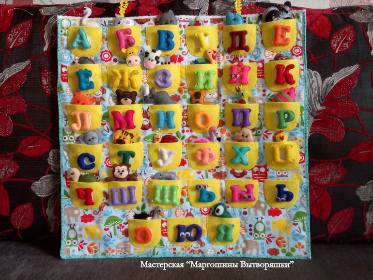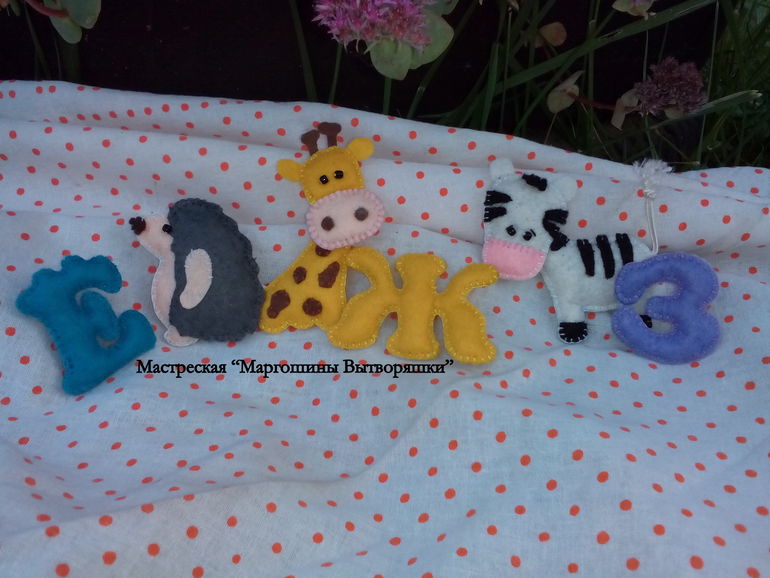 Сам планшет из хлопка "Животные" - его покупала отрезом, кармашки из фетра, ткань, на которой лежат игрушки - из какого-то набора (уже и не помню))). Игрушки и буквы тоже из фетра)