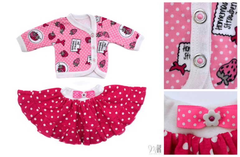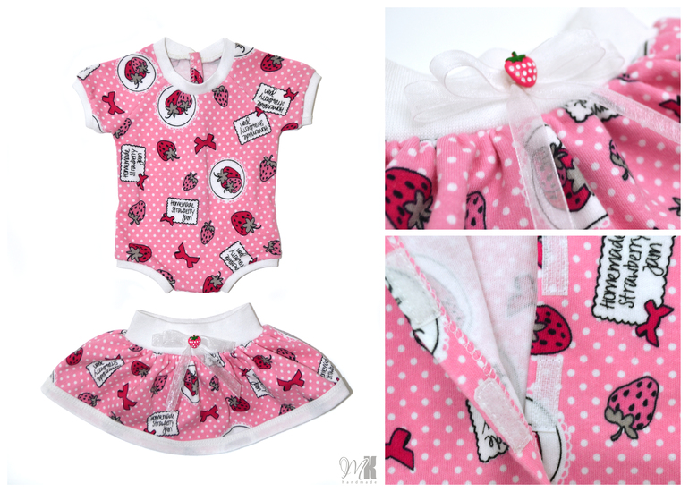 1. Комплект: боди и юбка из нежного интерлока с красивым принтом. Боди застегивается на липучку. Юбочка украшена бантиком из органзы и пуговкой, в виде клубнички.
