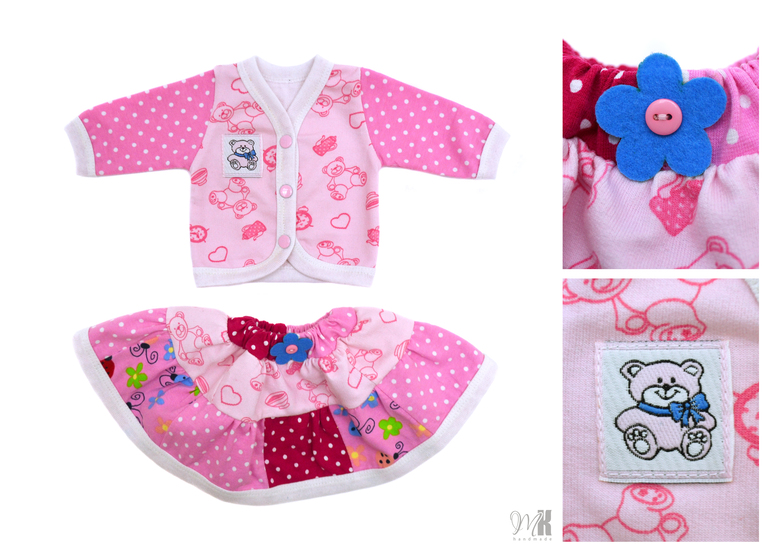 3. Комплект: кофточка из трикотажа двух видов и пышная юбка. Кофточка на застегивается на кнопки, украшена нашивкой в виде мишки. Юбочка украшена цветочком из фетра и пуговкой.