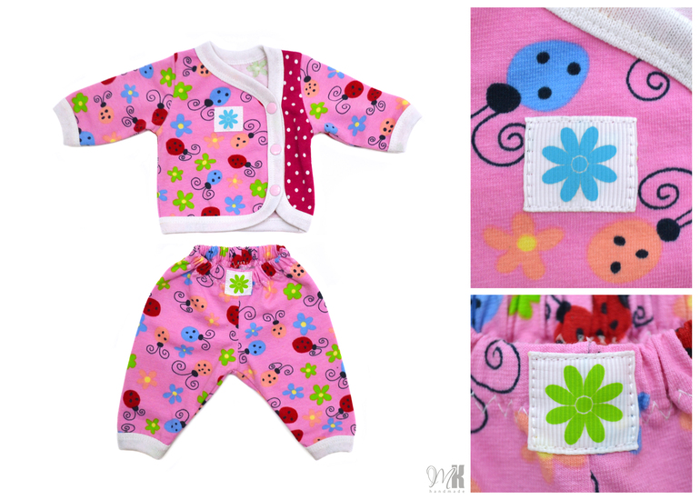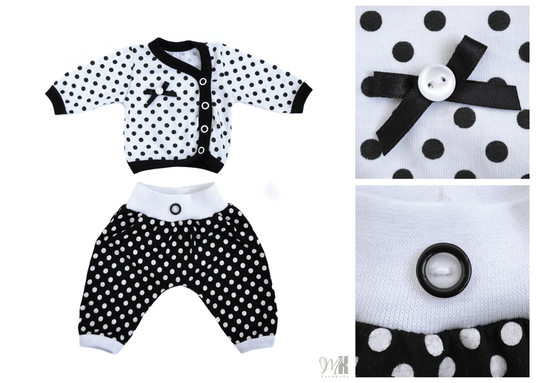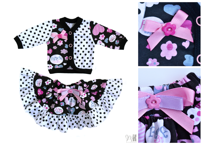 2. Комплект: кофточка из нежного интерлока с красивым принтом и пышная юбка из кулирки х/б в горошек. Кофточка застегивается на кнопки, украшенные стразами. У юбочки на поясе бантик из репсовой ленты и пуговка-цветочек.
