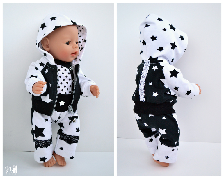 В капюшоне - подкладка в горошек, спинка украшена кружевом, а бегунок молнии бантиком и подвеской-звездочкой. Брючки тоже украшены кружевом и пуговкой в виде звездочки.