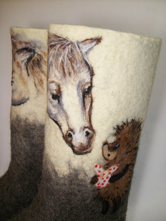 Валенки ручной валки из не крашенной натуральной шерсти. Мягкие и теплые на подошве, которая не скользит. Рисунок выполнен из шерсти и привалян в иглопробивной технике.