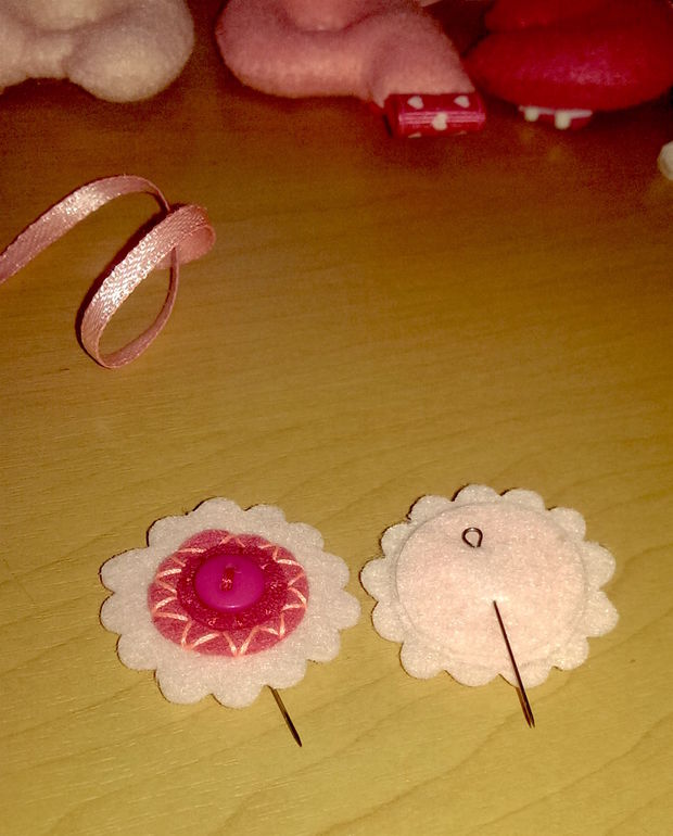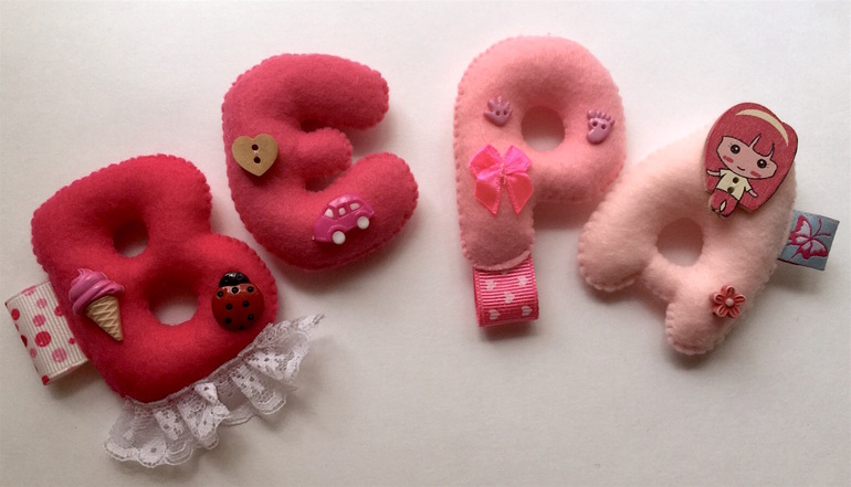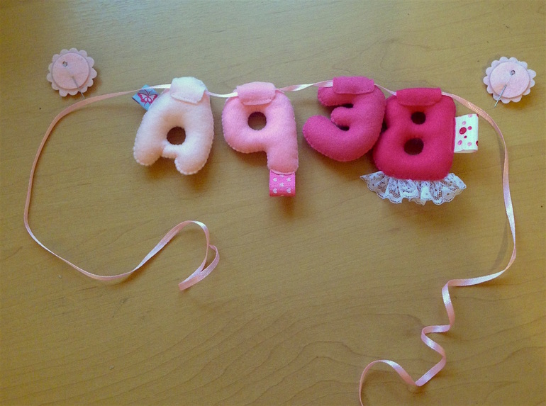 Буквы сшиты мононитью (прозрачная, похожа на леску), внутри синтепон + пуговки, бусины, репсовые ленты. Буквы можно двигать по ленте - раздвинуть или наоборот сделать поплотнее. Булавки украсила фетровыми цветочкам, чтобы было красиво. Фото с изнаночной стороны: