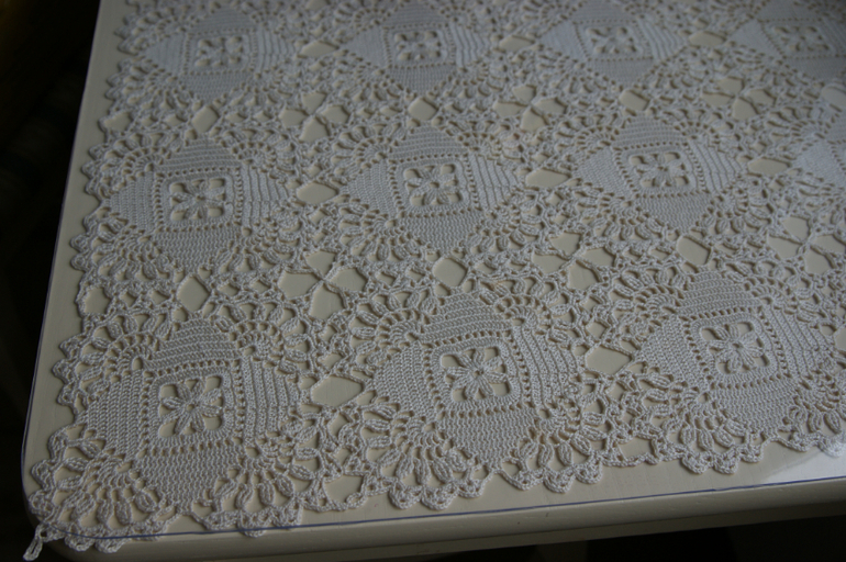 Здорово смотрится!! Намного лучше чем просто прозрачная клеенка. )) скатерть очень красивая, долго вязали?