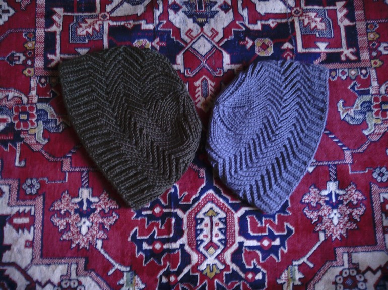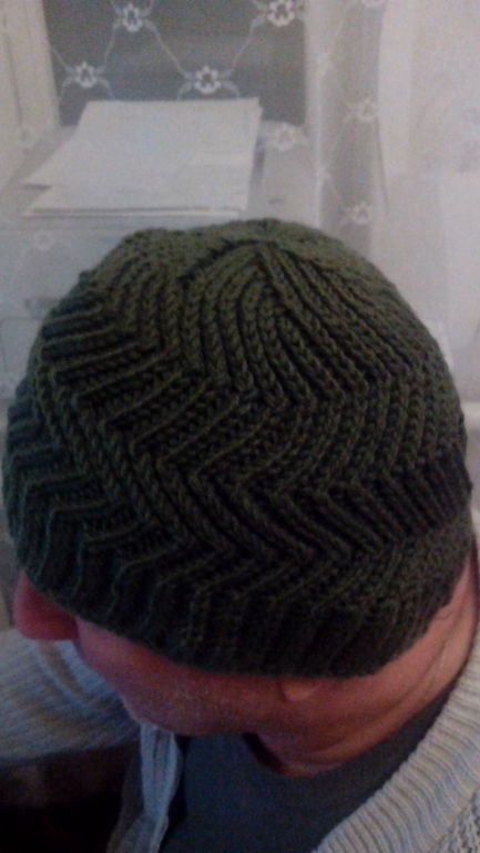 Ещё 2 шапочки. На этот раз мужские. Мужу серая, темно-зеленая - папе. Связались быстро. Первый раз пробовала патентный узорв круговом вязании. Называется Зигзаг удачи. Описание нашла в интернете, количество петель рассчитывала.