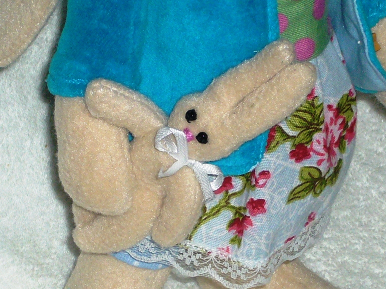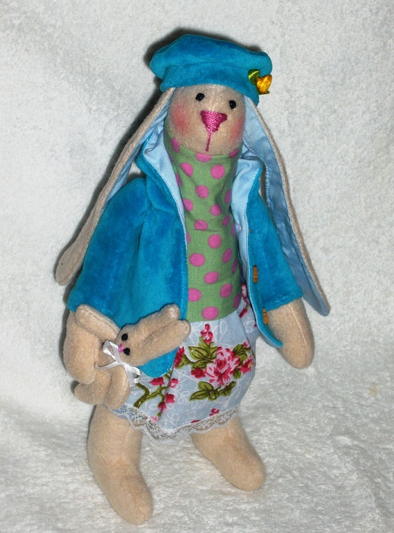 А было вот что. Я перешила из ее платья юбочку,уплотнила ножки,так как по неопытности они были слабо набиты и зая плохо стояла.И сшила ей водолазку и штанишки.И переделала носик.Вот такое преображение с ней произошло)))).