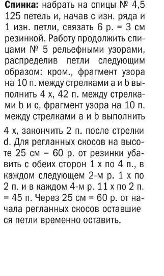 Для регланных скосов убавить с обеих сторон 1 х по 4 п, в каждом следующем 2-м 1 х по 2 п. и в каждом 4-м р 11 х по 2 п, в каждом втором ряду 6 раз по 2 петли = 45.