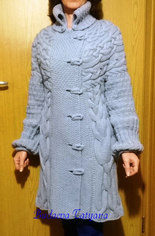 Это пальто связано тоже по заказу.Я уже как то вязала этот вариант,но тогда пряжа была другая и пальто получилось тяжелым,а в этот раз связала из ализе ланаголд,расход 700 гр.,спицы №5.