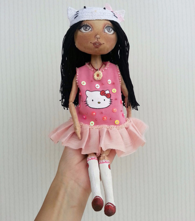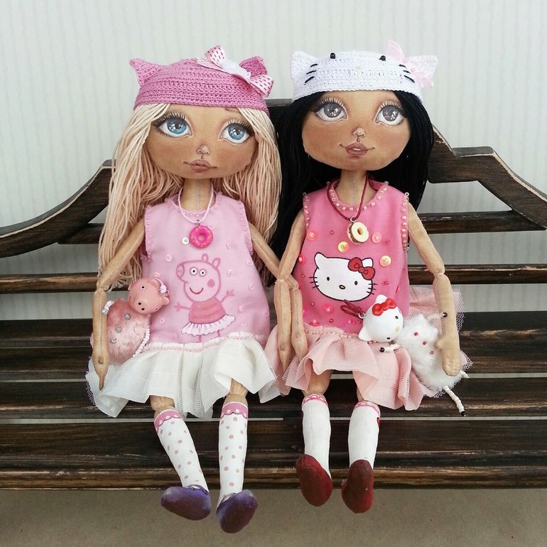 Милана любит Свинку Пеппу, Милена - HELLO KITTY! Обе подружки по 30 см, платья и шапки у них снимаются. Волосы вшитые, можно расчесывать и заплетать)). Для каждой девочки я сделала по любимой игрушке-подружке. Игрушку можно носить, как брелок. На брелоках маленькие карабины. Брелоки сделаны из: головы слеплены из La doll, покрыты акриловыми красками и лаком, тело из винтажного плюшика, лапки из бисера. Головушки у игрушек смешно качаются ))). Короче говоря, я влюблена в новеньких девочек)))! Из этой серии планирую еще несколько куколок.