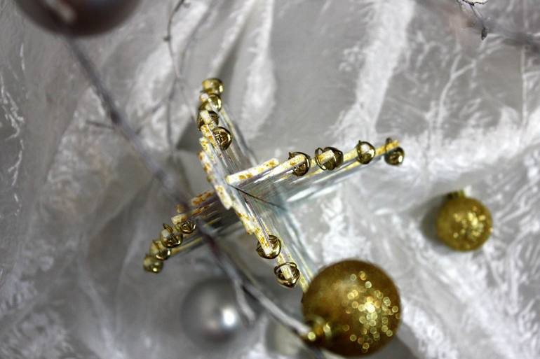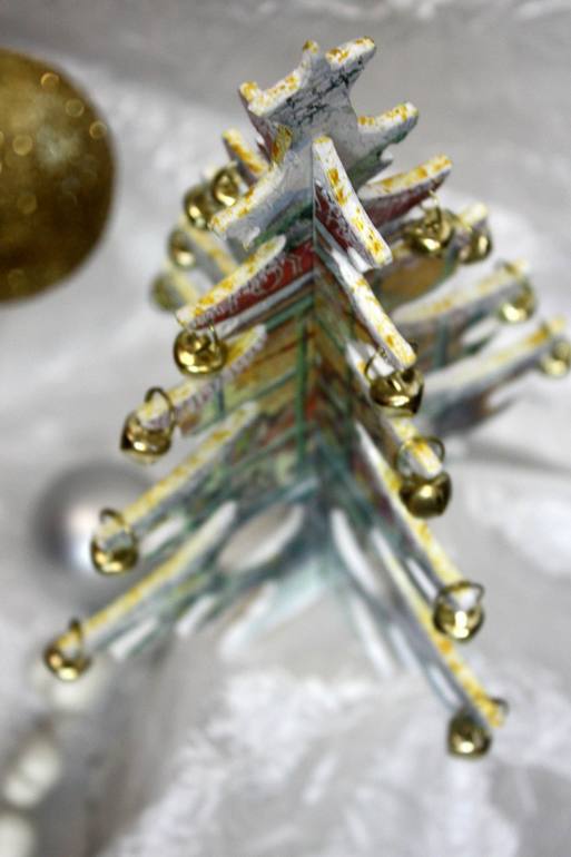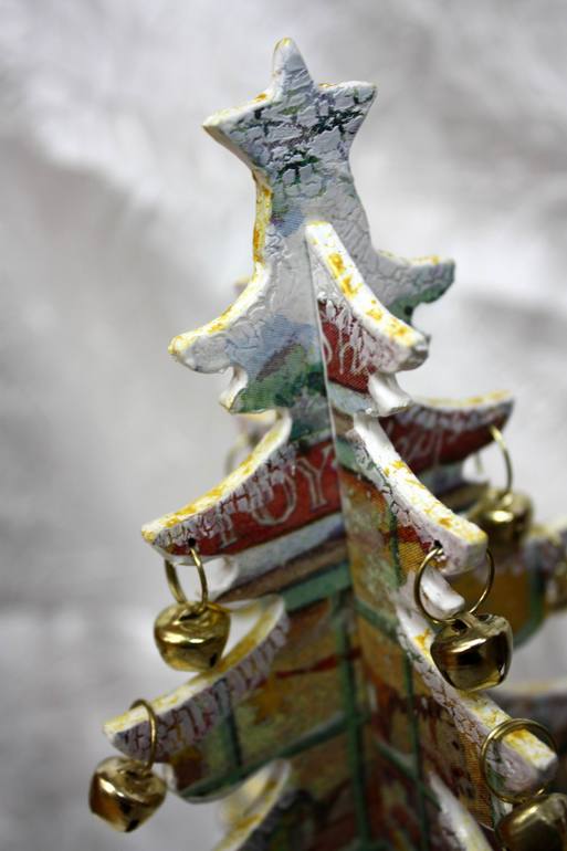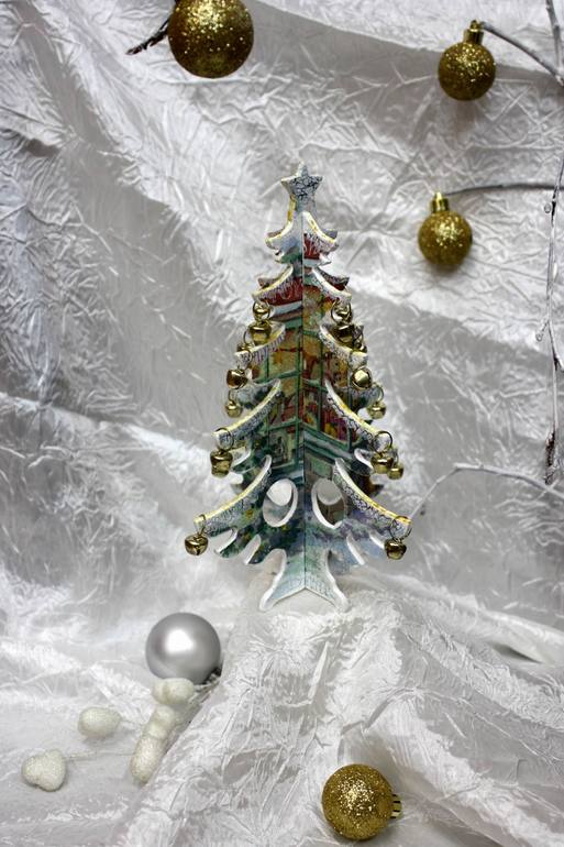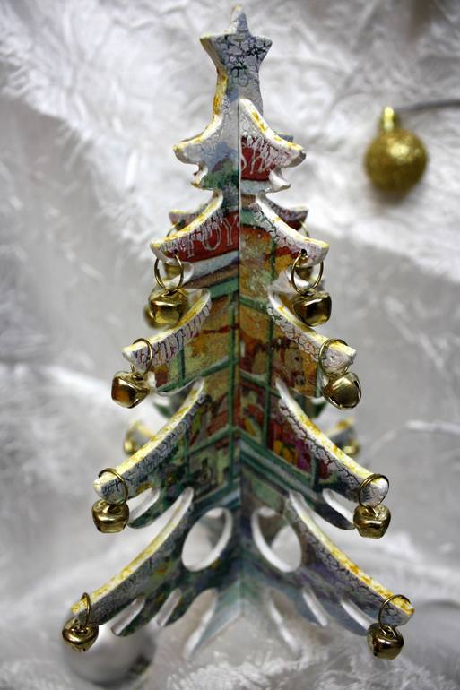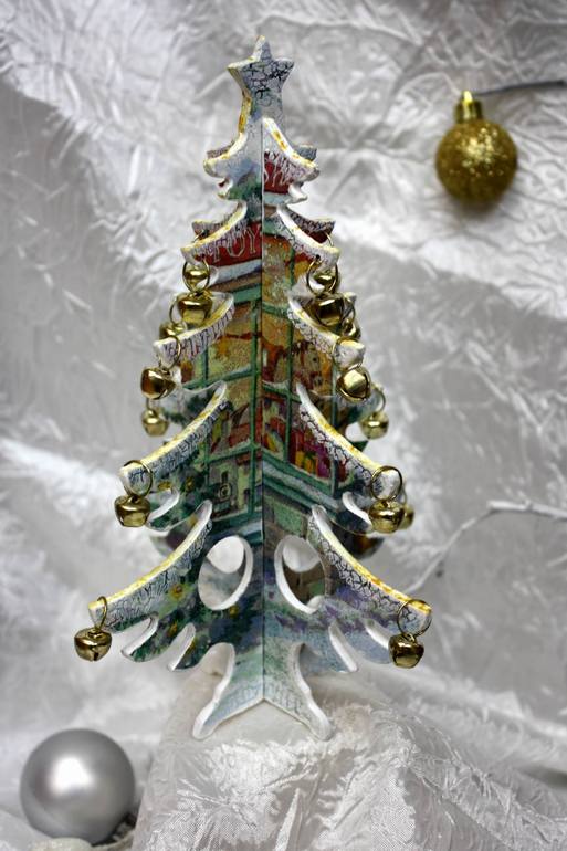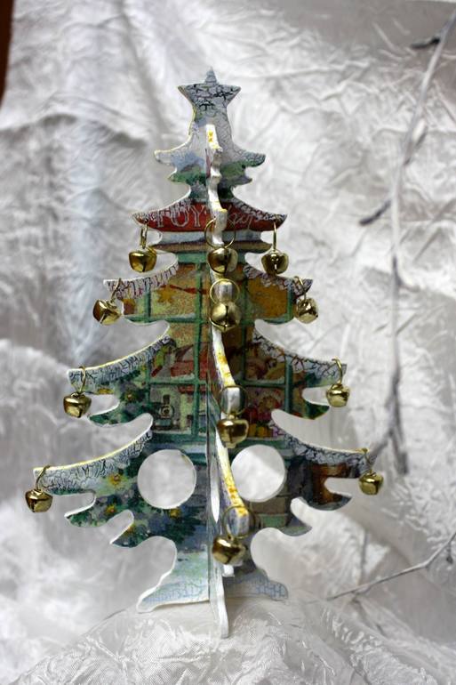 Не думала, что такая муторная работа будет с этой заготовкой. Резные края лап елок доставили хлопот. Но итогом я и сама осталась довольна. Использовала салфетку «Магазин игрушек» - очень ее люблю. Такое праздничное настроение она задает! По краям лап пустила кракелюр. Вместо игрушек бубенчики.