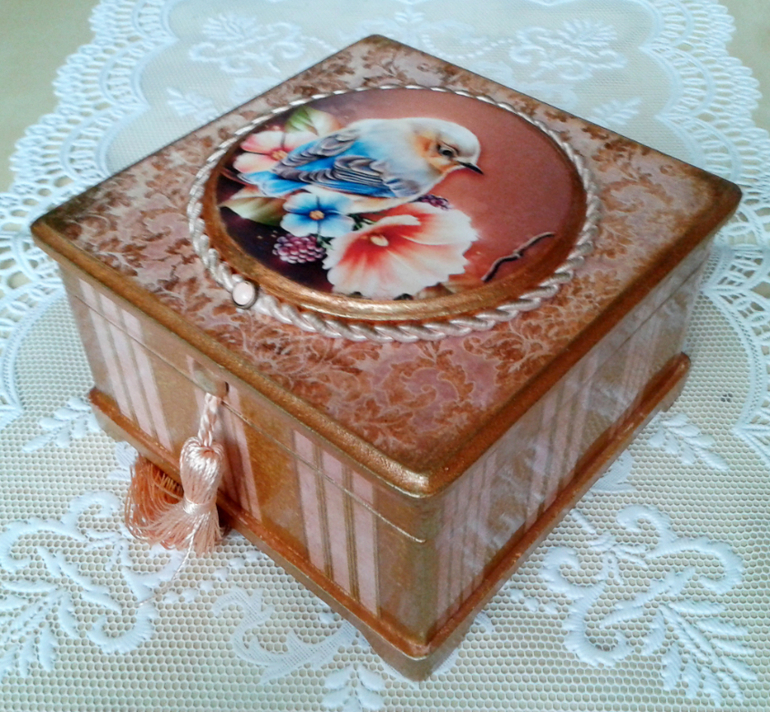 ДекупажХотелось сделать шкатулочку "из будуара", но кажется что-то пошло не так... Наверное птичка слишком яркая, но увы, ни одна другая на крышечку шкатулки "садиться" не захотела (убила 6 или 7 распечаток с разными вариантами. Отлично прижился только этот).