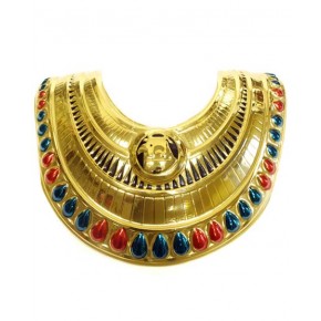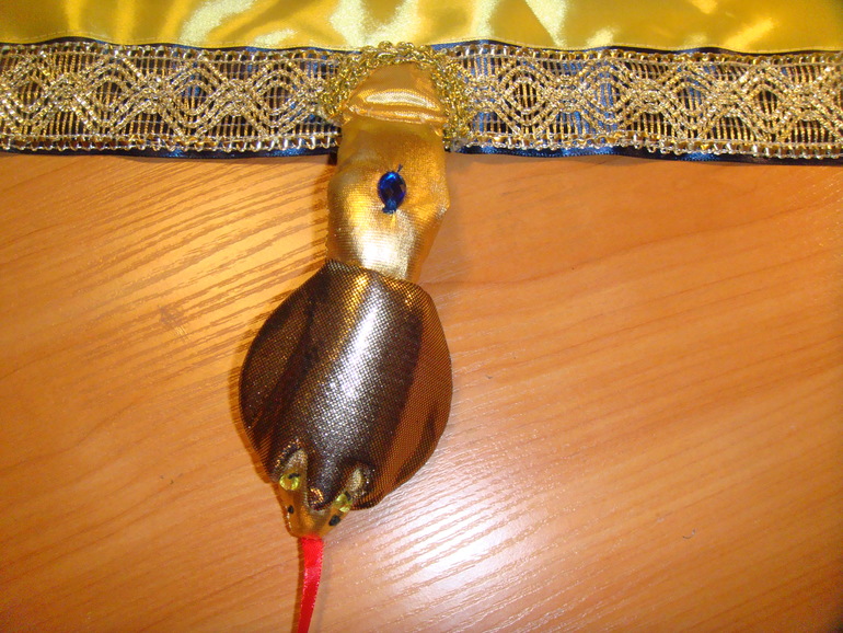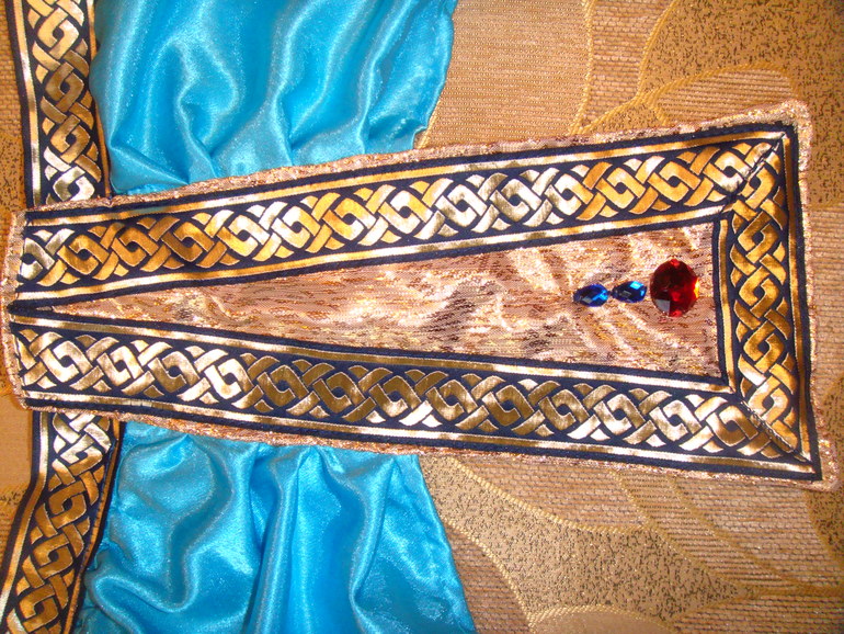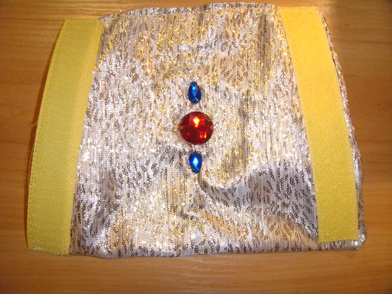 Нагрудник можно было бы и сшить из золотистой парчи и сине-красных страз, но мы воспользовались готовым, заменив тонкую резиночку крепления на золотистую тесьму.
