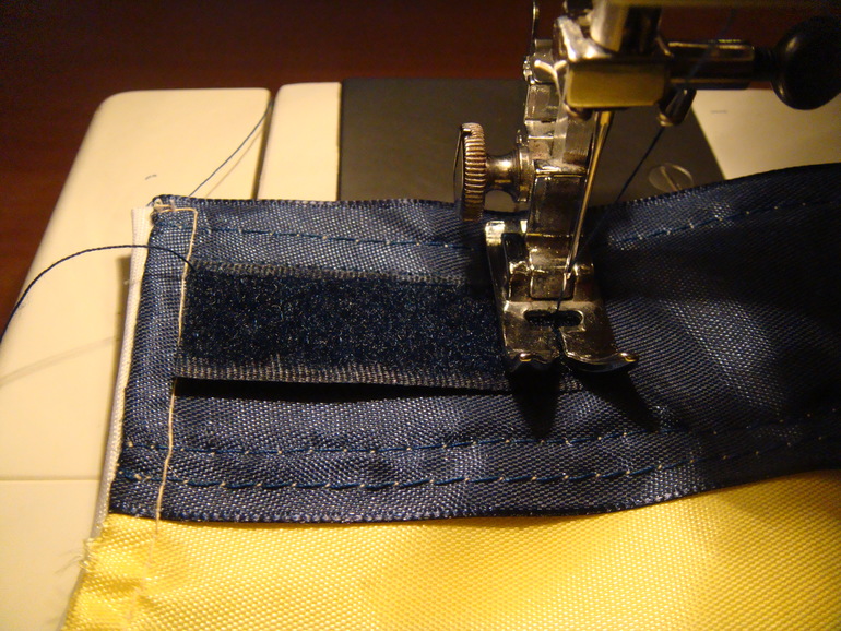 Пришить к тесьме-поясу, закрепить голубую ткань, присборив. Пришить липучку: