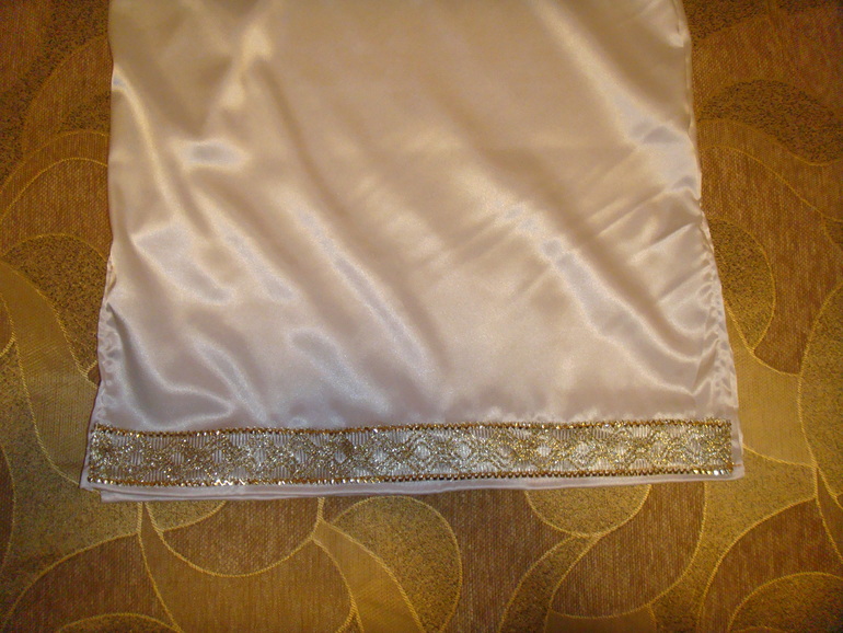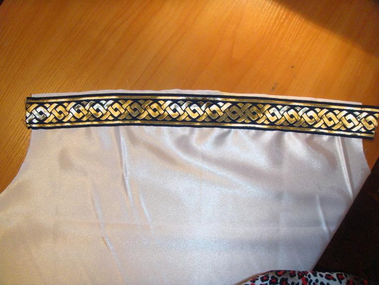 Пришить золотую тесьму по низу рубахи спереди и сзади: