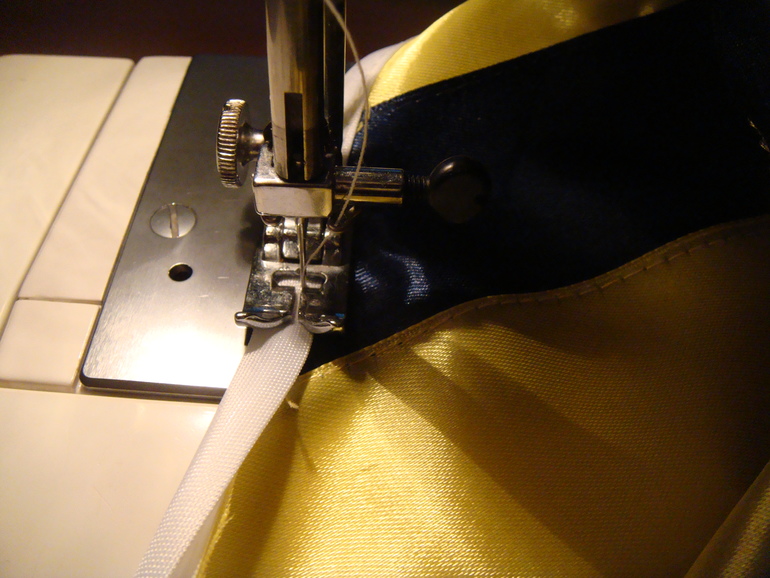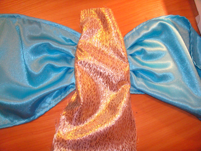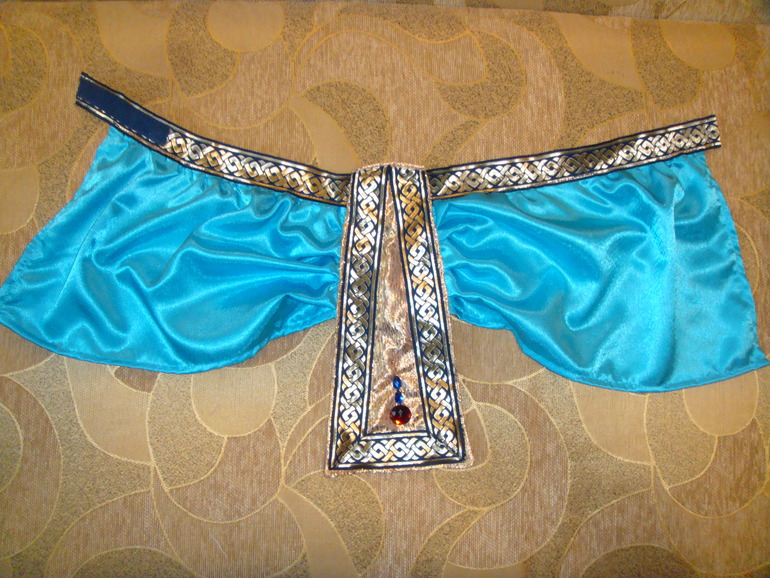 Обработать с 3 сторон голубые прямоугольники. С четвертой короткой стороны собрать складки и пришить к одной части золотистой выкройки пояса: