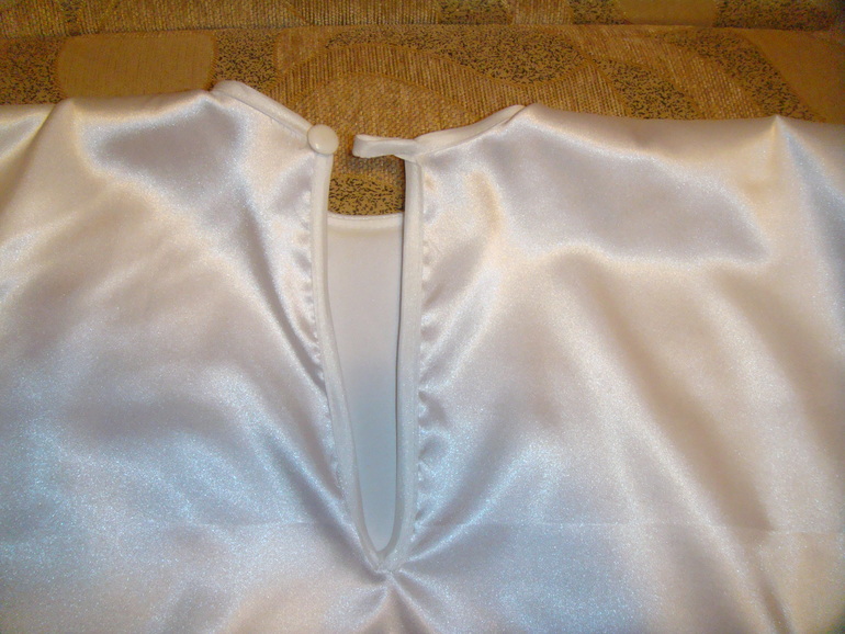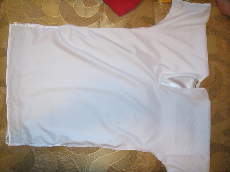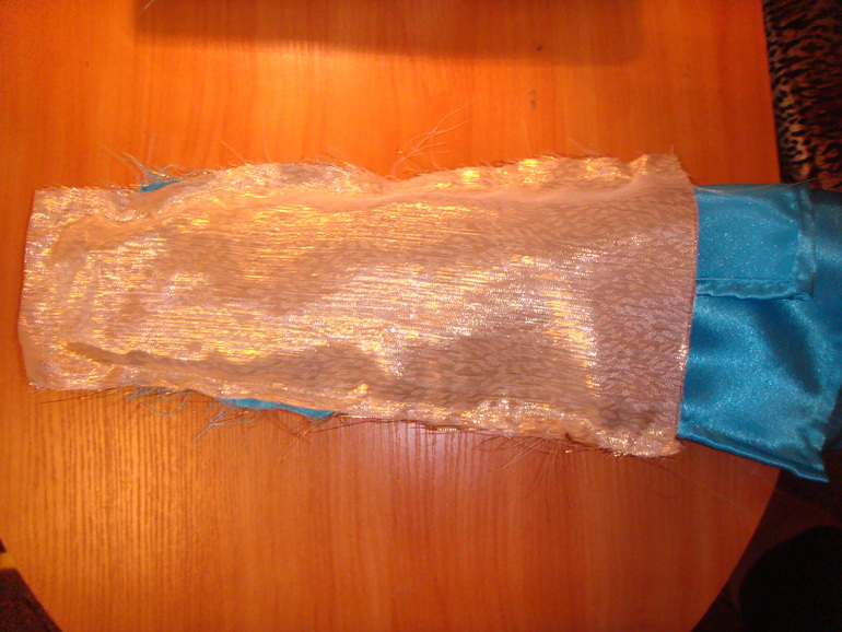 Две детали рядом - нарукавники. Из голубого атласа выкроить 2 прямоугольника, которые будут собраны на поясе: