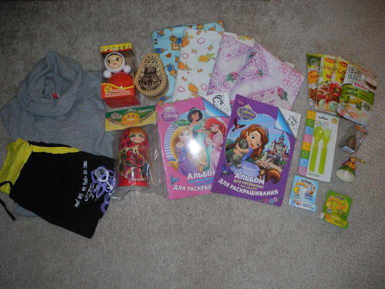 Ну и даже подарочки нашему мальішу, которьій пока в животике - пеленочки, здесь таких нет, пригодятся для чего то обязательно, неваляшка - я с такой в детстве играла, теперь и у моих деток будет! И детские ложечка с вилочкой, когда доростем))