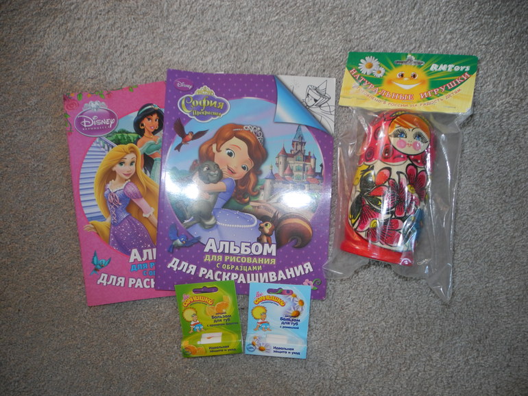 Доченьке достались расскраски с принцессами, которьіх она очень любит, класснючие бальзамчики для губ с ароматом ромашки и фруктов, думаю, мьі с ней поделимся и один она мне подарит))) посмотрим.... И красивая Матрешка в нашу коллекцию. Дочка с ними играет лучше, чем с обьічньіми куклами.