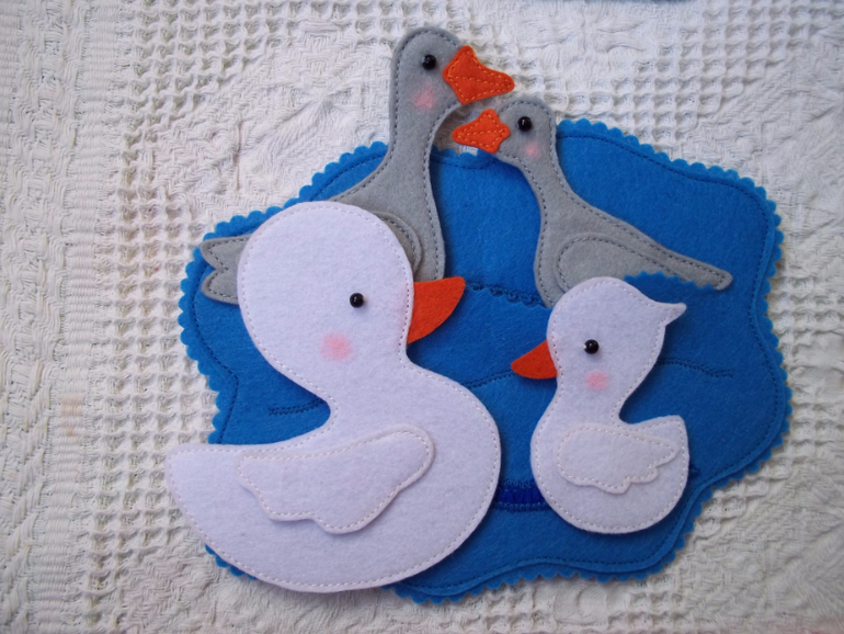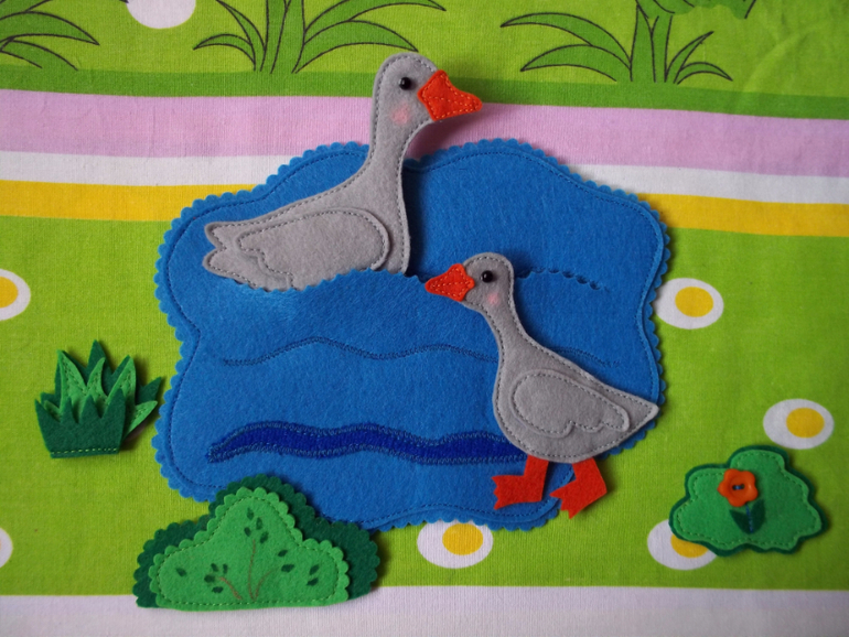 В пруду могут плавать утки и гуси (есть прорезь, куда вставить фигурки, и волна из велкроткани)