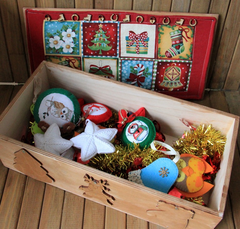 Положили пока только часть имеющихся елочных украшений ручной работы - все сделано золотыми ручками девочек с ББ, это добрые и позитивные обмены! Еще пока нет тут Катюшиных игрушек из Вологды, они у нас на балконе, надо найти. Но места полно, он большой и вместительный.