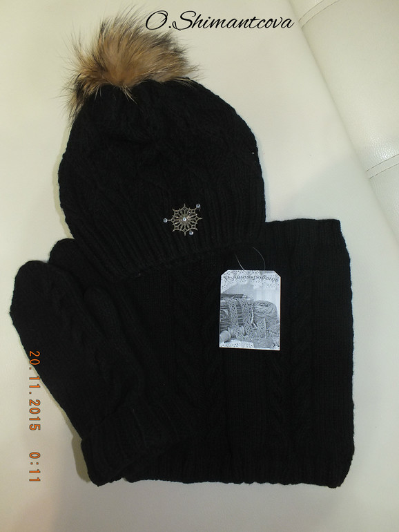 а по шапочке-рисунок из головы, вязала на ходу из накидов и лицевых, если присмотреться, то все 3 полосы ажура на шапке разные-так мудрила, что не смогла сама 3 раза одинаково повторить...)
