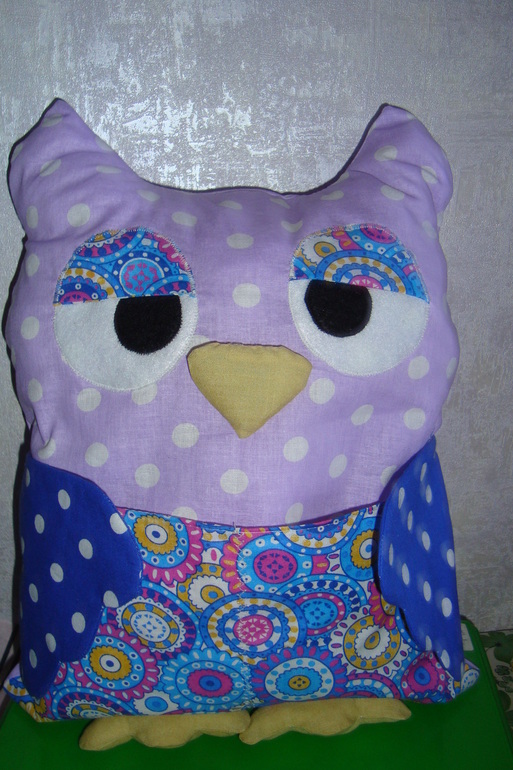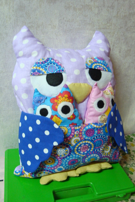 Девочки, всем привет. Сшила в садик такую подушку - хранительницу пультов. Вместо пультов сшила деток-совят. Смущают меня глаза совы. Пришились, конечно кривовато, съехал один глаз, пока пристрачивала на машине.