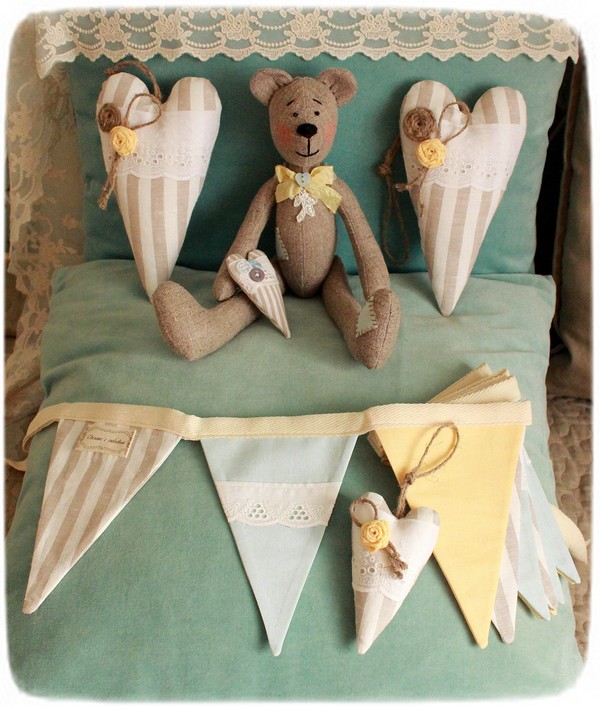 Очень мне нравится создавать готовые наборы для декора интерьера. Этот наборчик был разработан специально для украшения комнаты малыша. Выполнен из натуральных материалов (лен, хлопок, шерсть). В набор вошли; гирлянда из флажков (12 штук), тильда-мишка, два больших тильда-сердца и одно маленькое. Приглашаю к просмотру.