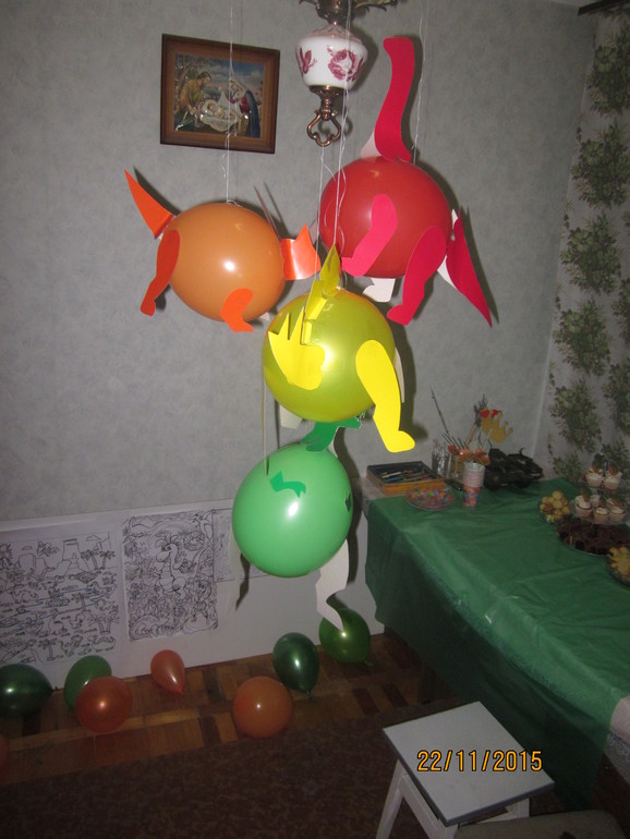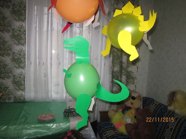 Еще делала динозавров из воздушных шариков и картона. На фото выглядит не очень, видно все огрехи, но в реале это было очень круто, дети были в восторге