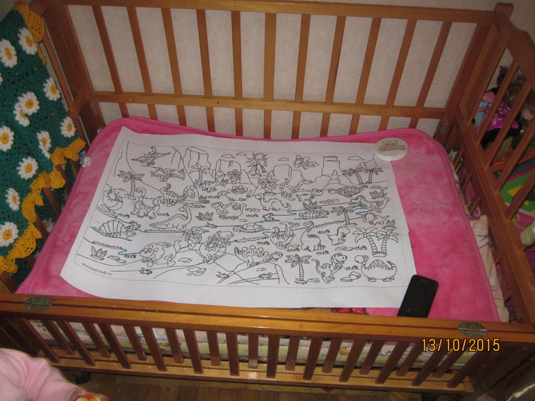 Еще для развлечения была большая раскраска, фото сделано в детской кроватке, чтобы был понятен размер. Такие раскраски есть в продаже, но мне было жаль 100 грн на такое чудо, поэтому распечатывала на листах А4 и потом склеила все воедино, всего 9 листов.